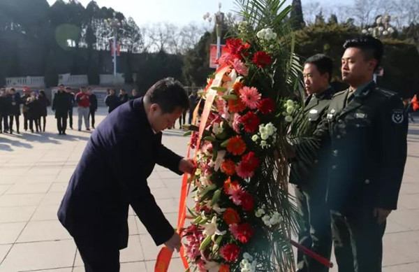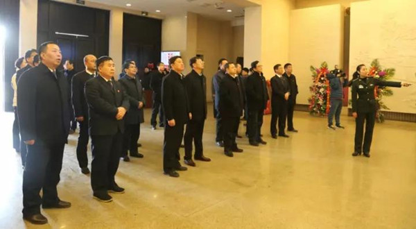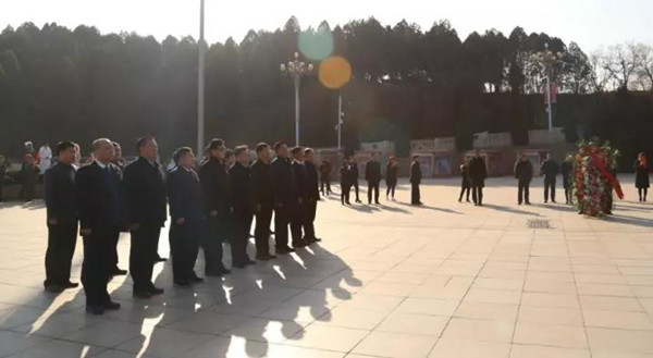 11月30日下午,湖光山色掩映下的西柏坡纪念广场红旗飘扬、庄严肃穆。在雄壮激昂的旋律中,唐树元等县委理论学习中心组成员齐声高唱中华人民共和国国歌。国歌唱毕,礼兵托起花篮,正步前行,将花篮摆放到五大书记雕像正前方。伴着婉转低回的音乐,唐树元缓步上前,仔细整理花篮缎带。怀着无比敬仰的心情,县四大班子党员领导干部向五大书记塑像深深三鞠躬。